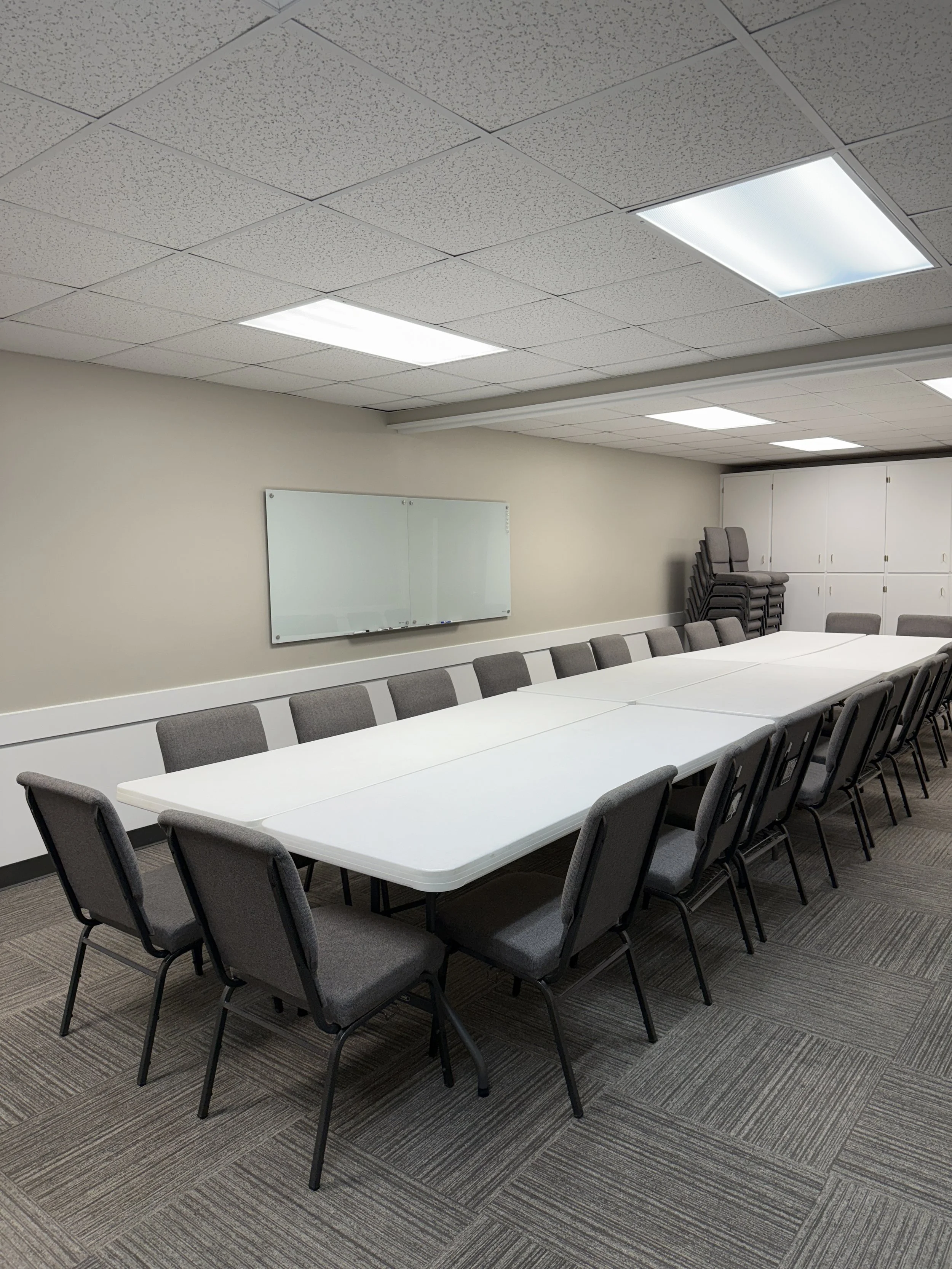 Our large meeting room can seat up to 30 people and comes with two whiteboards, as well as a TV.